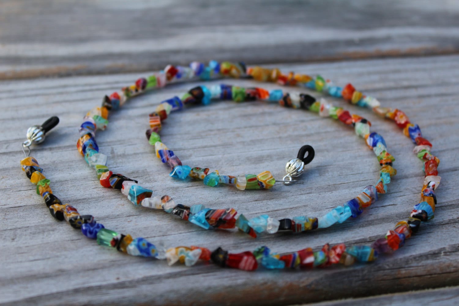 This is a colorful Millefiori Eyeglass Chain that is full of fun and detail! It's a wonderful accessory in that it matches any color, yet looks amazing with black and white as well.