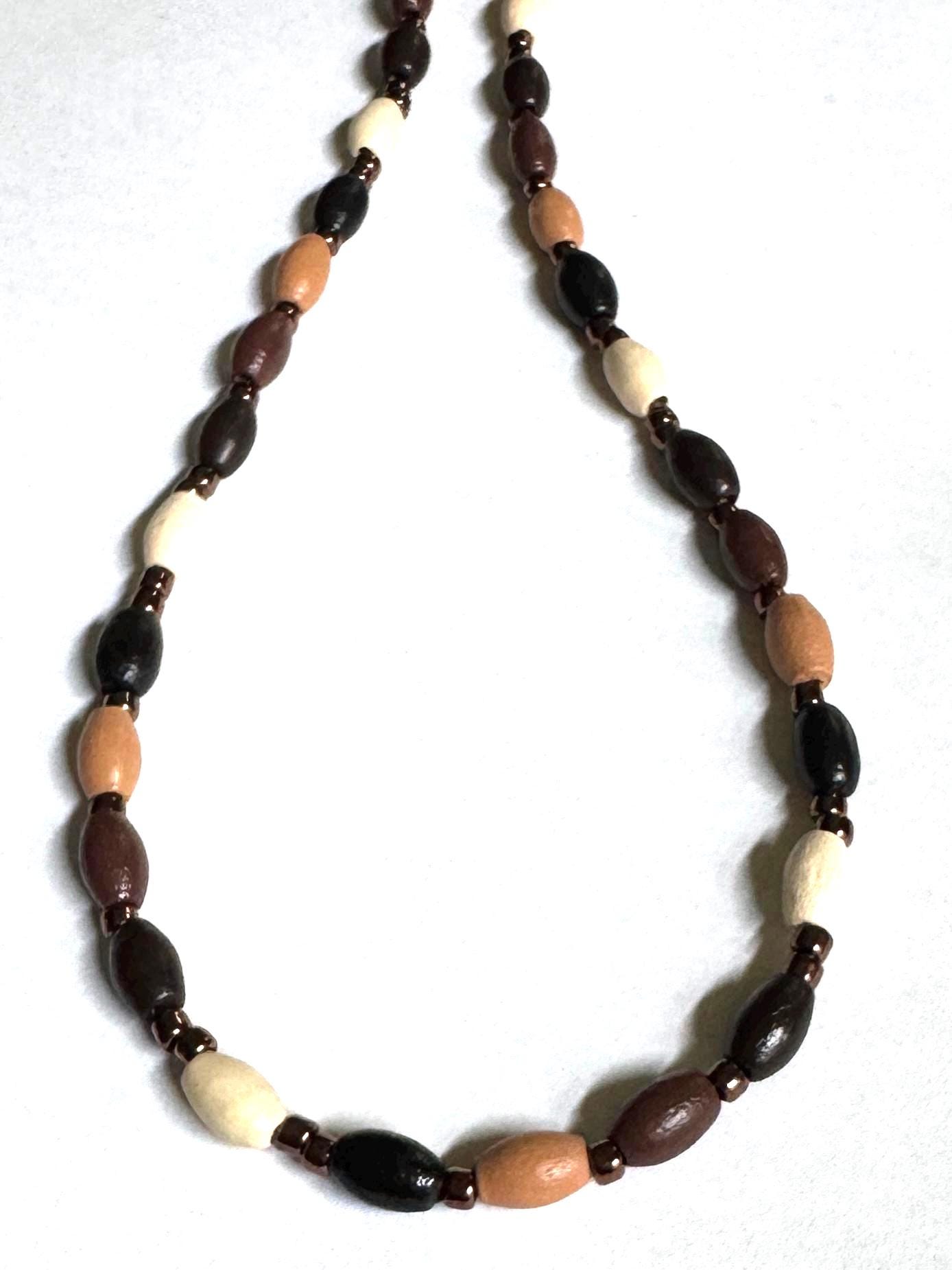 This natural wood bead necklace is made using oval shaped wood beads. The colors alternate in shades of white, black, brown and tan. They are separated by tiny bronze colored seed beads which give it a little shine between the colors.
