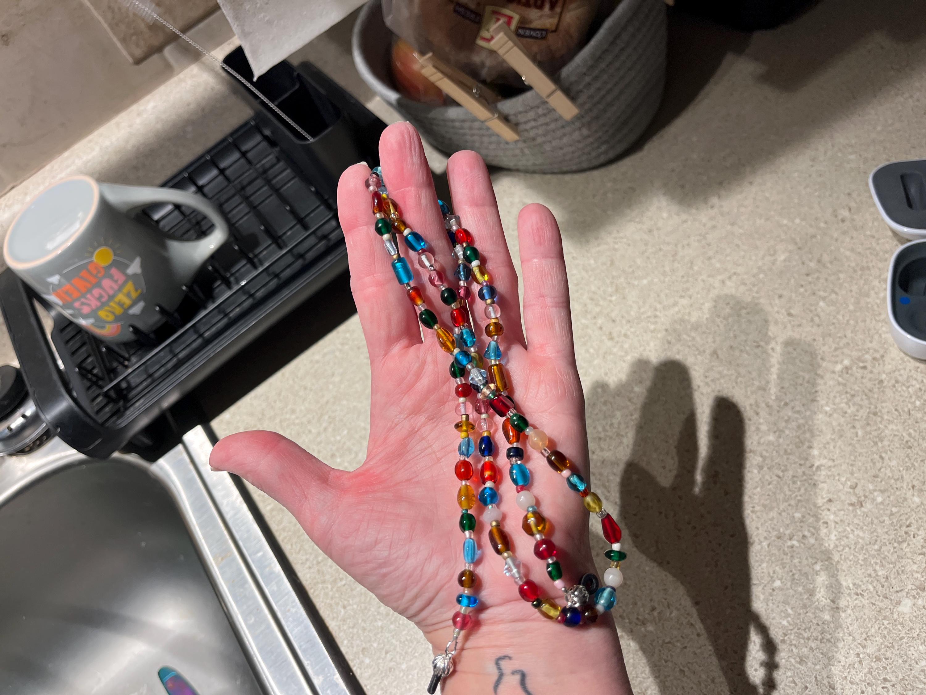 If you like dark, bold colors, why not use this colorful eyeglass necklace to hold your glasses! It is the perfect accessory since it is multi color and multi shape! It is available with either a metal loop ring at the bottom (to hang your glasses on), or with eyeglass ends (designed to attach to both arms of your glasses. You can see your choices in the last four photos.
